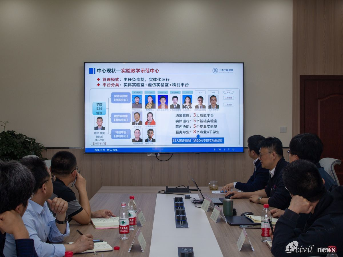 专业认证办主任任东亚、土木工程国家级实验教学示范中心副主任李福海、张迅分别就学院实验室建设工作情况、土木工程专业建设及学科人才培养等三个方面发表讲话,共同交流工作心得。