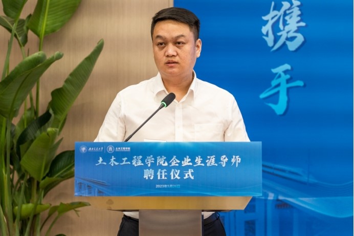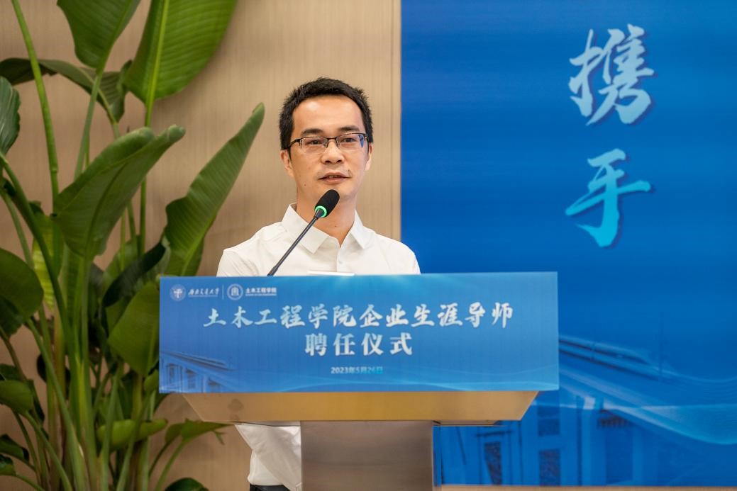 中交四航局第一工程有限公司党委组织部部长、人力资源部经理杜金作为企业生涯导师代表进行了发言。杜金校友首先感谢学校学院对企业生涯导师们的信任和支持,随后向在场师生分享了自己的导师工作经历,建议导师们要以“用心、用情、用力”六字作为今后的工作准则,对待学生要真情实意、要毫无保留,鼓励同学们要满怀信心,勇敢地进行职业生涯探索。