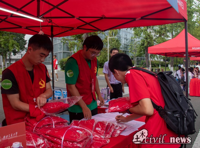 晨光熹微之时,一群红色的身影已经在学院迎新点位上忙碌着。新生物资清点摆放,件件明晰;报到流程熟悉掌握,样样落实。志愿者和党员服务队的同学们各自分工,在迎新点位严阵以待,在辅导员的引导下有条不紊地进行新生身份核验、物资发放等工作。