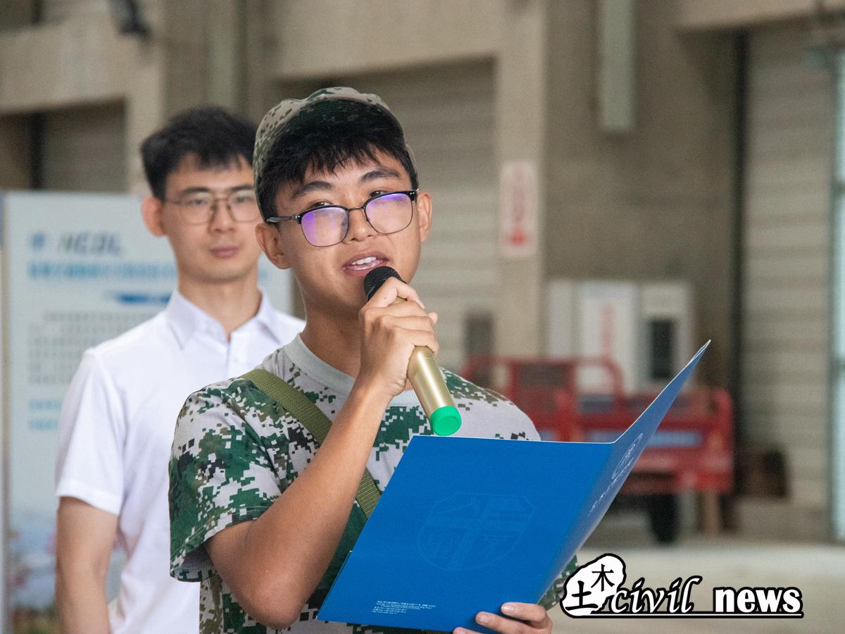 随后,蔡一鸣同学代表全体2023级军训新生们进行发言。他对中铁建工集团为同学们带来消暑降温物资表示感谢,同时也表达了同学们对圆满完成军训的决心和对校企合作的支持。“军鹰十连,翱翔九天;搏风抗雨,共创辉煌。”他表示,接下来将继续坚持在军训中以高标准要求自己、磨炼自己,与学院同学们一道在今后的学习生活中发扬交大精神,为学校发展注入活力,为祖国建设增添力量,成就自己的无限可能。
