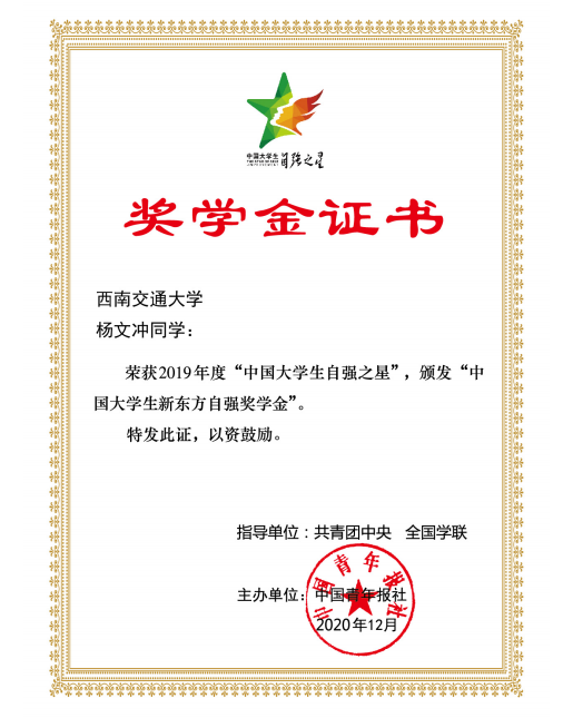 学生荣获“中国大学生自强之星”