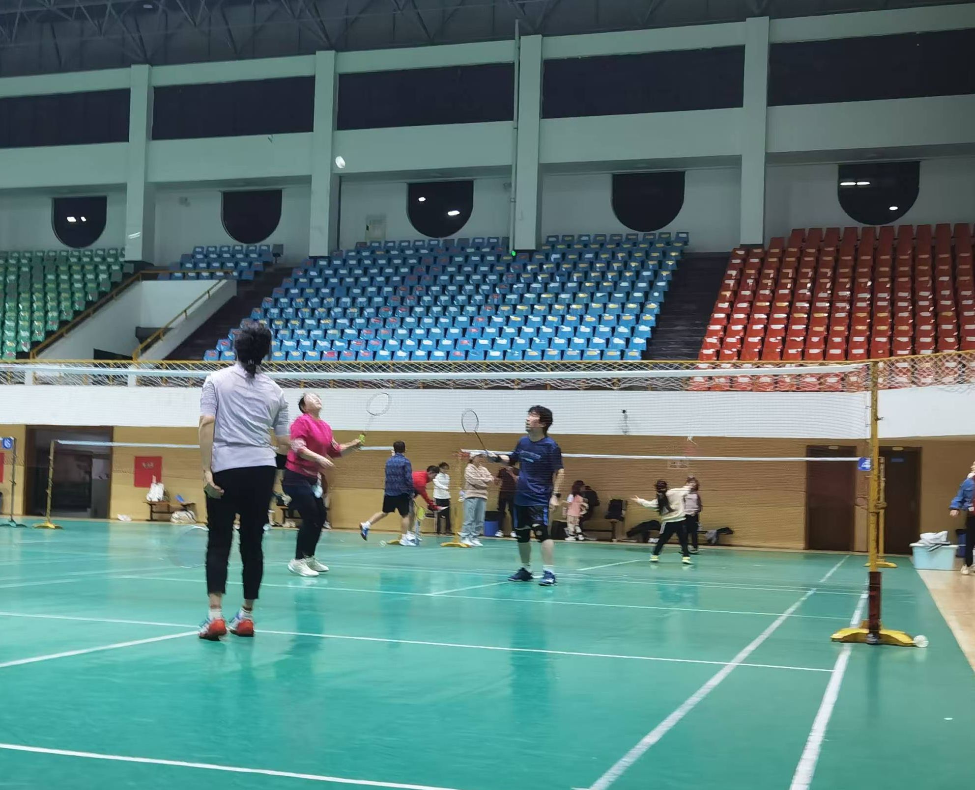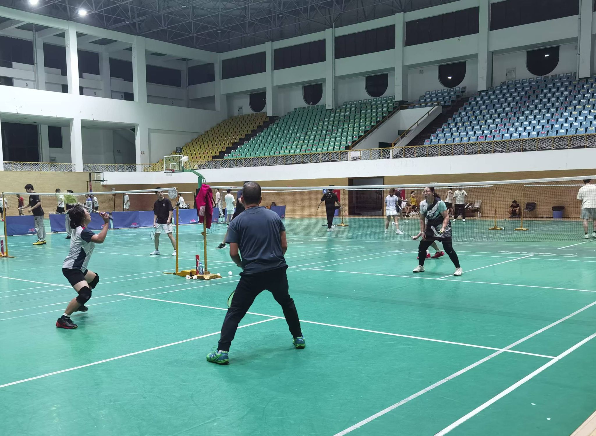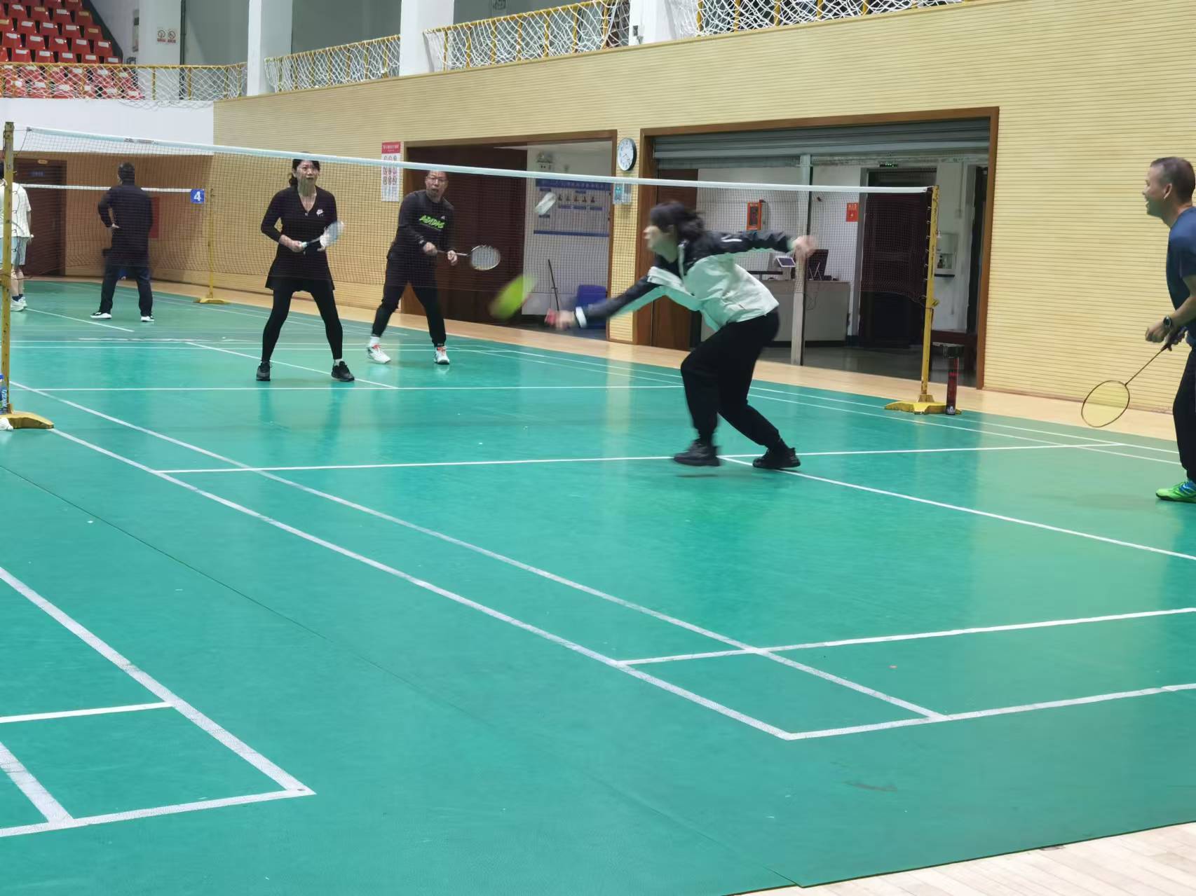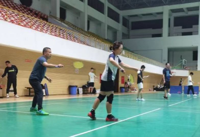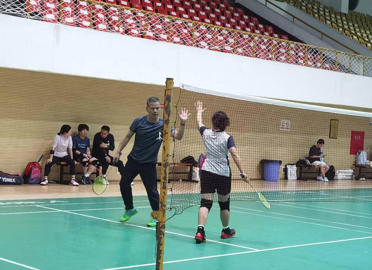 训练期间,教职工们组队自由练习,男双、女双以及混双队伍纷纷登场,技术娴熟的队员热心教导其他队员,大家在欢快的氛围中锻炼球技、培养默契,为即将到来的大赛积极备战。