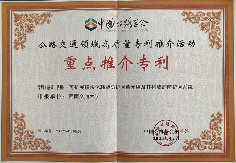 “可扩展模块化耗能防护网单元组及其构成的防护网系统”提供了一种模块化单元式分布耗能被动防护网系统及安装方法,具有变形路径短、耗能效率高、锚固点少、独立分布式耗能、可独立拆装等特点,可解决现有被动柔性防护系统支撑绳锚固点施工难度大、工作量大、柱间防护单元无法独立工作及独立更换、防护系统无法任意扩展的问题,兼具较高的经济性、易恢复性和可扩展性。该专利还曾荣获2022年度四川专利奖创新创业奖。