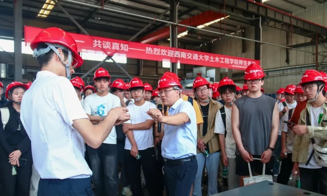 同期,土木学子前往双建路桥公司车间开展研学,深度体验工业实景课堂。同学们通过一段发展历程短片、十组产品展示、一次车间实景教学、一场工程师对话,系统了解路桥构件生产工艺,实现了理论认知与产业实践的深度融合。