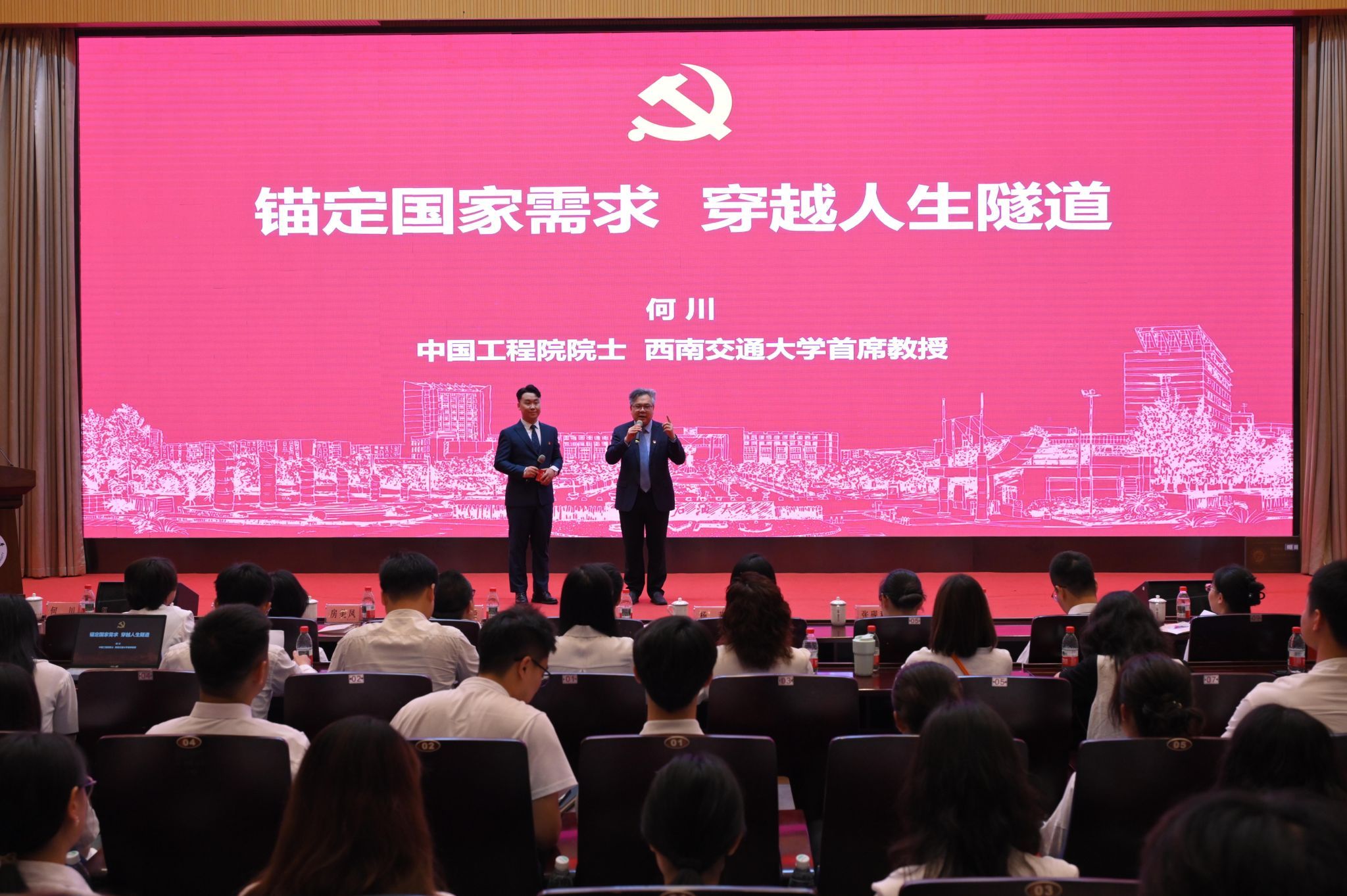 首席教授、博士生导师何川以《锚定国家需求穿越人生隧道》为主题,向现场及在线观看的青年师生党员生动讲述了他三十余年如一日扎根交通强国建设一线的奋斗历程。