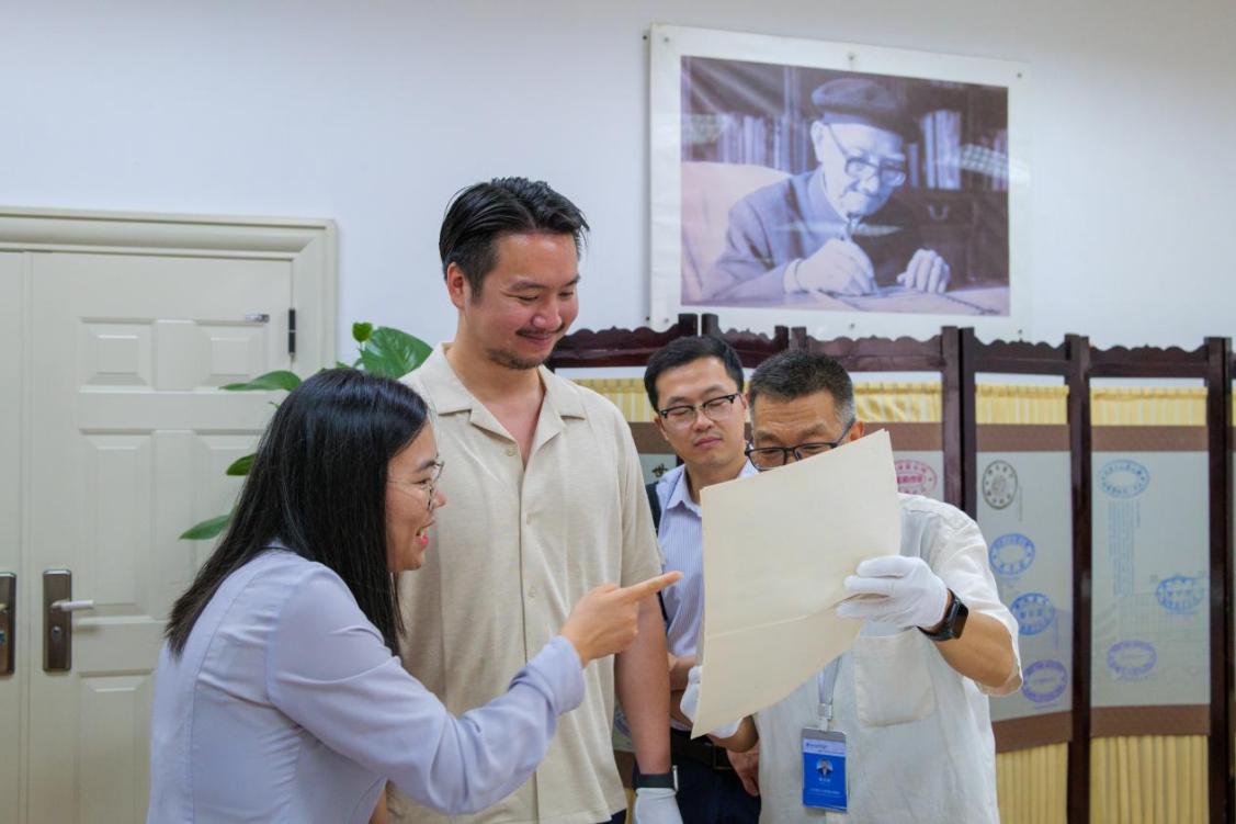 在图书馆,夫妇受到热情接待。在图书馆馆长和大使的引导下,他们重点参观了馆内珍藏的林同炎先生求学时期的宝贵史料。在古籍特藏区,他们见到了林同炎先生当年在唐山交大求学时的毕业设计手稿原件,泛黄的纸张、工整的字迹,无声诉说着青年林同炎严谨治学的态度和在工程领域展现的非凡天赋。这些珍贵档案是色情av影片