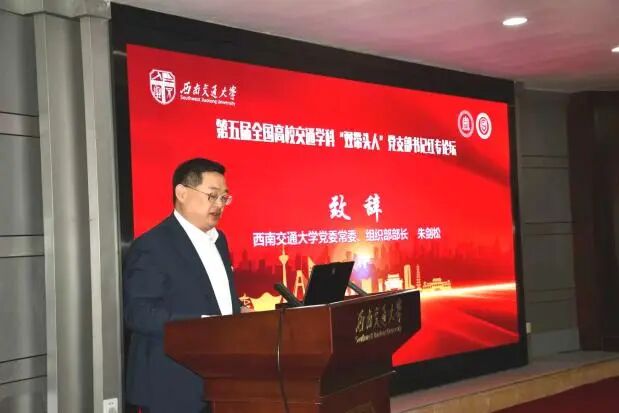 党委常委、组织部部长朱剑松致辞,介绍了学校办学、在轨道交通领域的成就及党建工作成绩,强调“双带头人”党支部书记深化“一融双高”,一体推进教育、科技、人才发展,为交通强国和区域经济发展主动担当。