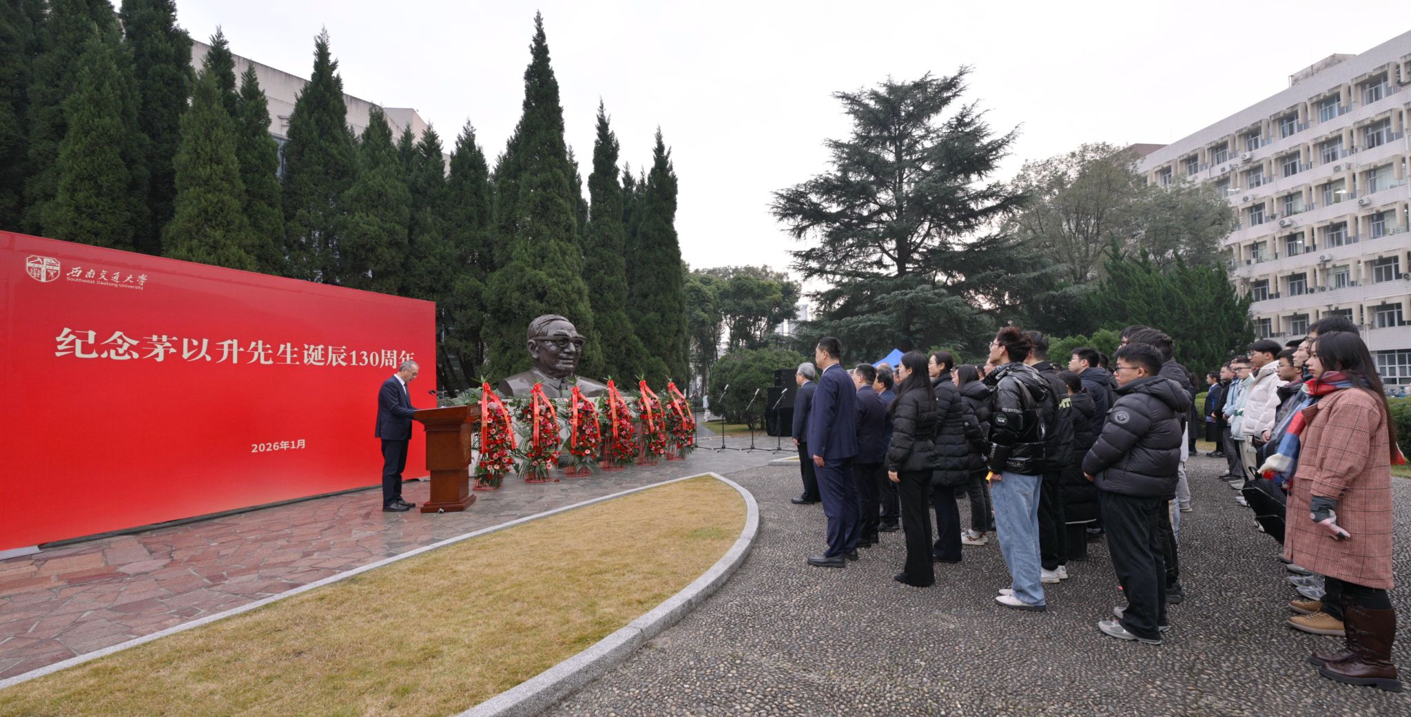 会前,与会嘉宾在九里校区茅以升铜像广场共同参加“缅怀茅老”茅以升铜像献花仪式。余敏明主持仪式。