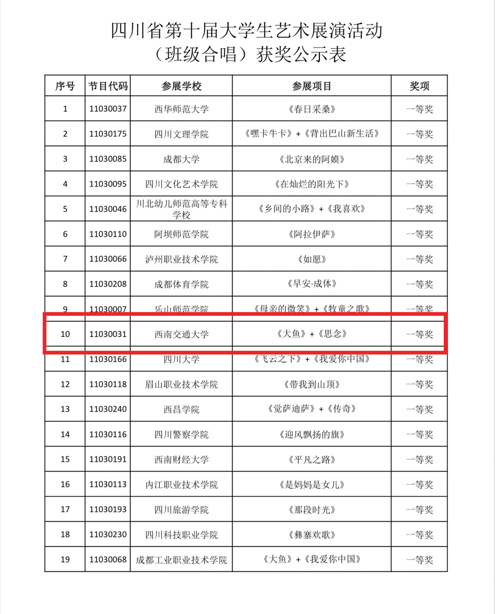 为进一步推动五育并举发展,展示我省高校艺术教育成果,展现当代青年大学生的精神风貌,由四川省教育厅主办,成都师范学院承办,温江区人民政府协办的四川省第十届大学生艺术展演活动在成都师范学院举行。经专家评审,此次展演中声乐(班级合唱)获奖名单出炉。在本次展演中,色情av影片 参展项目《大鱼》以及《思念》荣获一等奖。获奖名单公示如下: