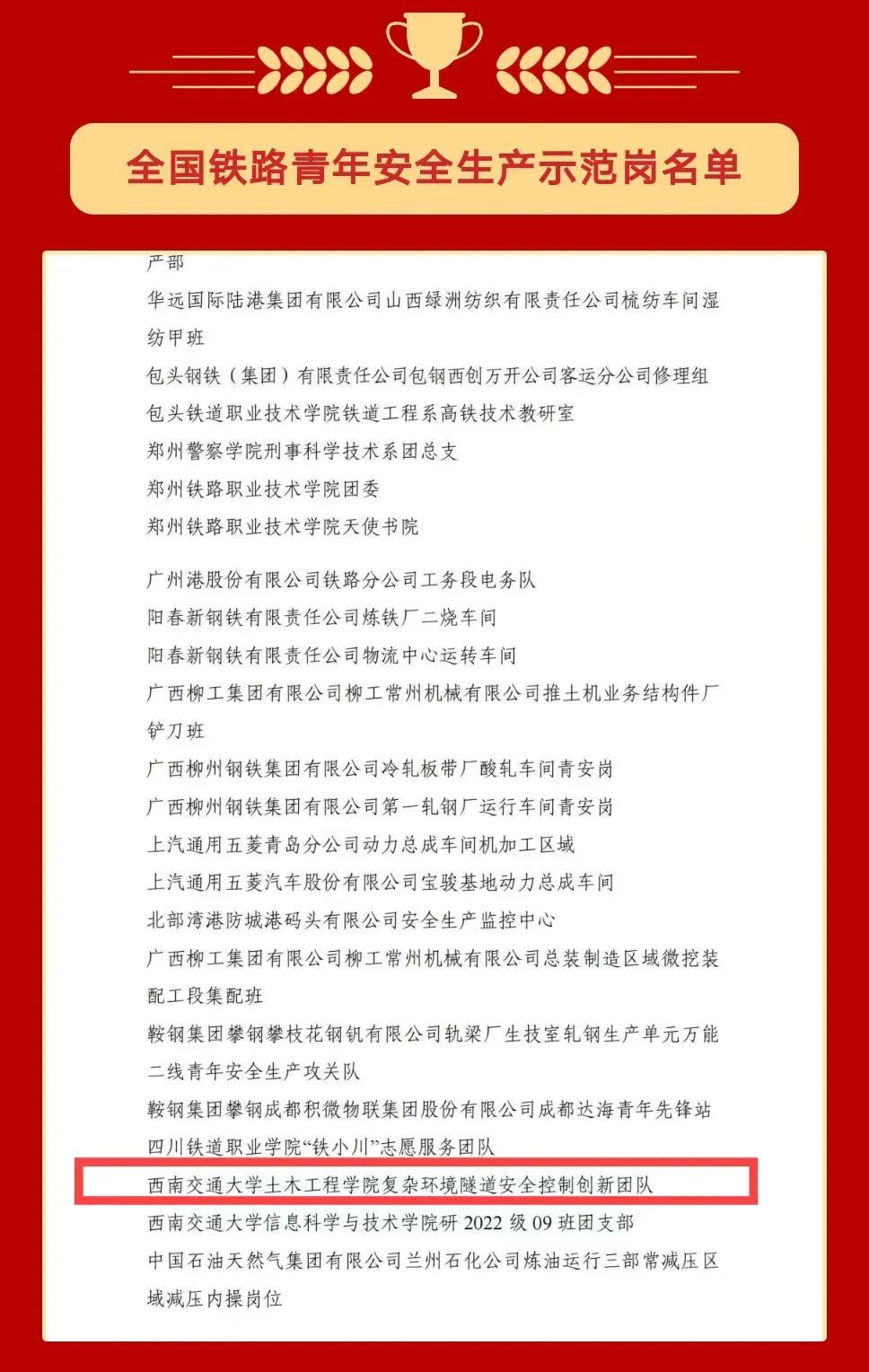 复杂环境隧道安全控制创新团队荣获“全国铁路青年安全生产示范岗”。