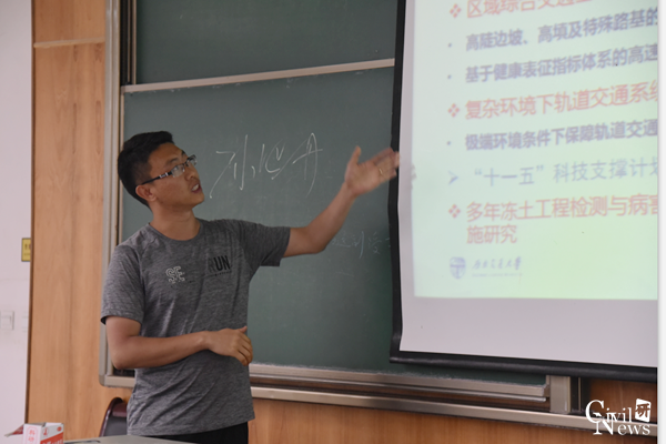 随后,各科研团队的教师代表依次上台,就所在团队的主要研究方向、正在开展的科研工作、团队在支持本科生科研等方面的情况进行介绍。参与此次活动的教师代表有:地下工程系的方勇教授、于丽副教授、郭春副教授、申玉生副教授;桥梁工程系的占玉林副教授、强斌老师;道路与铁道工程系的赵才友副教授、袁胜洋副教授、刘钰老师、陈德老师;岩土工程系的张迎宾副教授、杨涛副教授、徐华副教授、袁冉老师;建筑工程系的周强老师、许浒老师;交通土建系的王玉锁副教授;防灾减灾研究所的孙晓丹副教授。老师们的精彩介绍赢得了同学们的阵阵掌声。