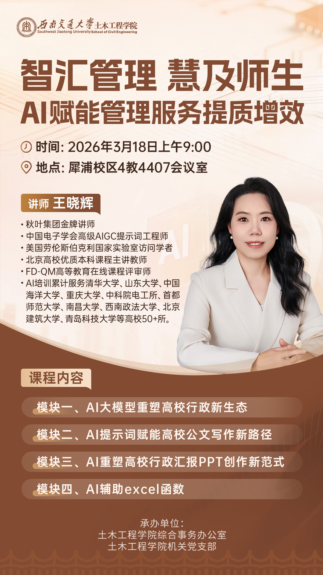 为深入推进教育数字化转型,以人工智能技术赋能学院管理服务工作创新升级,切实提升管理服务人员的数字素养与高效办公能力,推动管理服务提质增效、精准赋能师生教学科研与学习生活,学院特开展本次培训,以智促管、以慧服务,让 AI 技术真正成为管理服务工作的硬核助力。