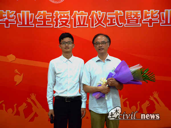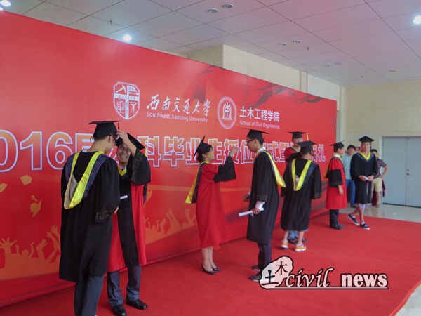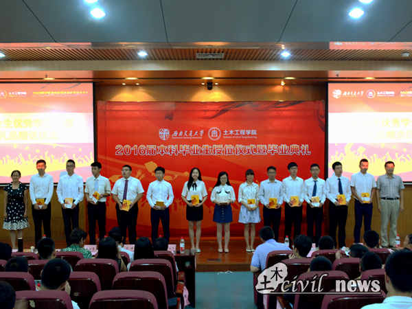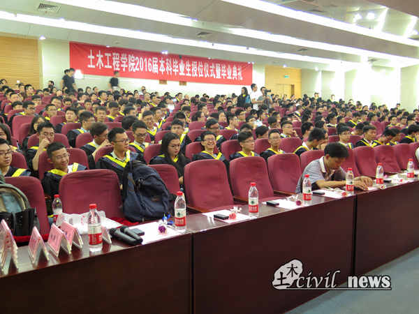 2016届本科生毕业及授位决定》。崔院长说,四年以来,土木学院2012级全体同学勤奋学习、勇攀高峰,顺利完成了本科阶段的教育教学任务,决定授予他们工学学士学位。他希望2016届本科生能够在今后继续发扬“竢实扬华,自强不息”的交大精神,在各自的人生舞台上再创辉煌。授位决定宣读完毕后,高波教授、钱永久教授、易思蓉教授和苏谦教授来到授位区,依次为2012届本科生授位并合影留念。