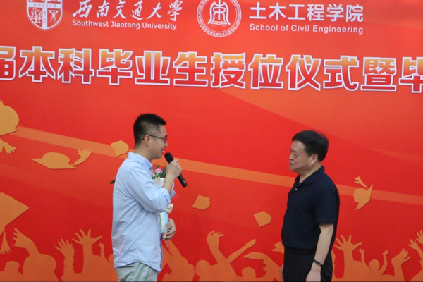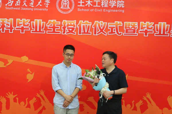 伴随着现场的掌声,吕鹏举与罗永坤老师一同走上舞台,献上了早已准备的鲜花。罗永坤老师向在座的老师和同学们微微鞠躬致意后,发表了自己的感想。他首先表示传道授业解惑,帮助学生掌握知识是老师的本职工作。但是今天能够亲耳听到学生对自己的评价和赞美,心中却是满满的感动。当罗永坤老师说到这一个月将是他工作三十周年后,台下的掌声经久不息,罗老师的眼角也泛出了丝丝的泪光。