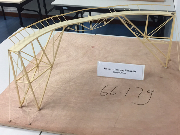 设计的桥梁顺利通过了静载实验;但是,在动载测试时,铁球停在了离桥梁末端约3 cm的位置,从而未能获得动载得分。