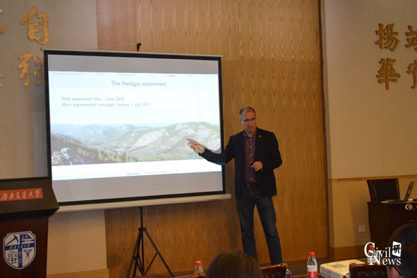 Jakob Mann教授在本次讲座中介绍了为NEWA(新欧洲风图谱)所做的众多实验。NEWA旨在从技术和理论基础、政策制订及工业应用方面提升风资源预测和风场规划能力。教授首先讲述了利用陆上扫描激光雷达技术,结合海洋和卫星信息,减少近海岸风资源估计的不确定性的实验。同时利用配备有运动传感和补偿系统的激光雷达对渡口附近进行测试。并且介绍了在具有复杂地形的山脉中开展的预实验与主要实验。最后Jakob Mann教授谈到欧洲的许多科研单位与美国的众多院校与科研机构进行合作来完成Perdigao实验(NEWA计划的一部分)。教授在报告中列举了许多风工程实验例子,语速平缓,讲解通俗易懂,在场的老师与学生对这种理念表现出了浓厚的兴趣。
