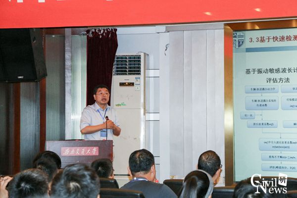 王平教授对目前高速铁路轨道结构关键科学问题的研究进行了报告。王教授从目前高铁扣件存在的伤损问题,引出高频振动对钢轨及扣件影响的研究成果。从理论分析到数值模拟到现场测试再到针对性的室内模型实验,最后带着研究成果回到了对于扣件的伤损和改进上,逻辑清晰,结构完整。
