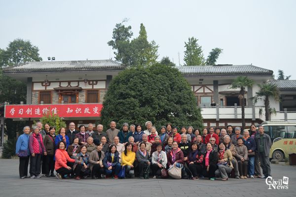 鹤翔山庄地处青城山山麓,位于成都市都江堰市西南,东距成都市区68公里,处于都江堰水利工程西南10公里处。青城山脚下四周林木青翠,四季常青,老教师们抵达目的地,刚合影结束,便四处活动开来,他们在校医院医护人员的陪护下,三五结伴,踏青聊天,年龄较大的老教师互相搀扶,精神抖擞的向前迈进。